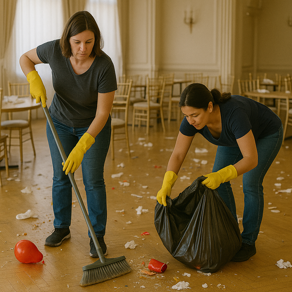 • Sonderreinigung: Entfernung von Flecken, Getränkeresten, Konfetti, Dekorationsrückständen oder klebrigen Böden – alles kein Problem für unser geschultes Team.